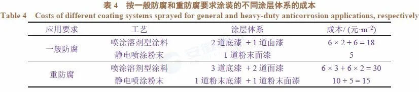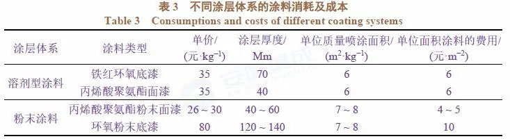 表3列出了在涂層厚度滿足技術要求的基礎上按理論計算的每平米施工費用。