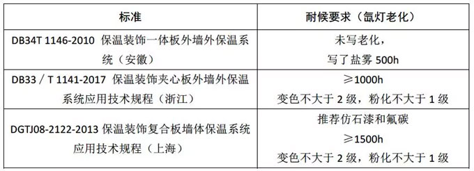 可以看出一體板的這些地方標(biāo)準(zhǔn),相對(duì)來(lái)說(shuō)弱化或規(guī)避了涂層耐候性的指標(biāo),而且未明確不同涂層種類的差別,一刀切的規(guī)定大約在1000~1500h的耐候性。這個(gè)指標(biāo)很像多彩漆和氟碳漆的耐候性之間找了一個(gè)平衡點(diǎn),其實(shí)主要原因在于我們現(xiàn)在定標(biāo)準(zhǔn)很多時(shí)候必須平衡參與的多個(gè)廠家的建議和利益,因此指標(biāo)往往會(huì)折中處理。